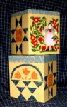 I have also donated an America Tissue Box cover. The donated box is 5" cubed and has the dinner plate designs on each side. $15.00 + shipping. Also available is a special box cover with your choice of two BOP designs and two dinner plate designs. $25.00 + shipping. Shown is the Bride and the Imaginary Groom blocks. Sister pattern designs also available.